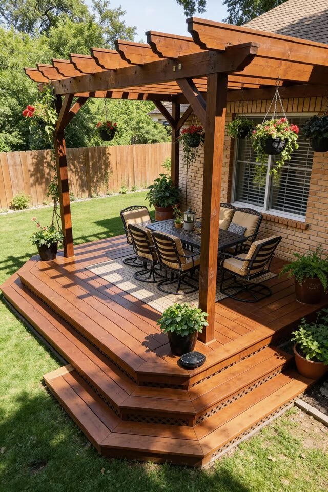 We love how the warm-toned stain visually connects the deck floor, pergola beams, and steps into one cohesive story. That’s color continuity doing heavy lifting. Notice the stepped platform edges too. Levels naturally guide movement and make the deck feel intentional, not accidental. For recreating this look, keep furniture slightly smaller than indoor dining sets so circulation stays airy.