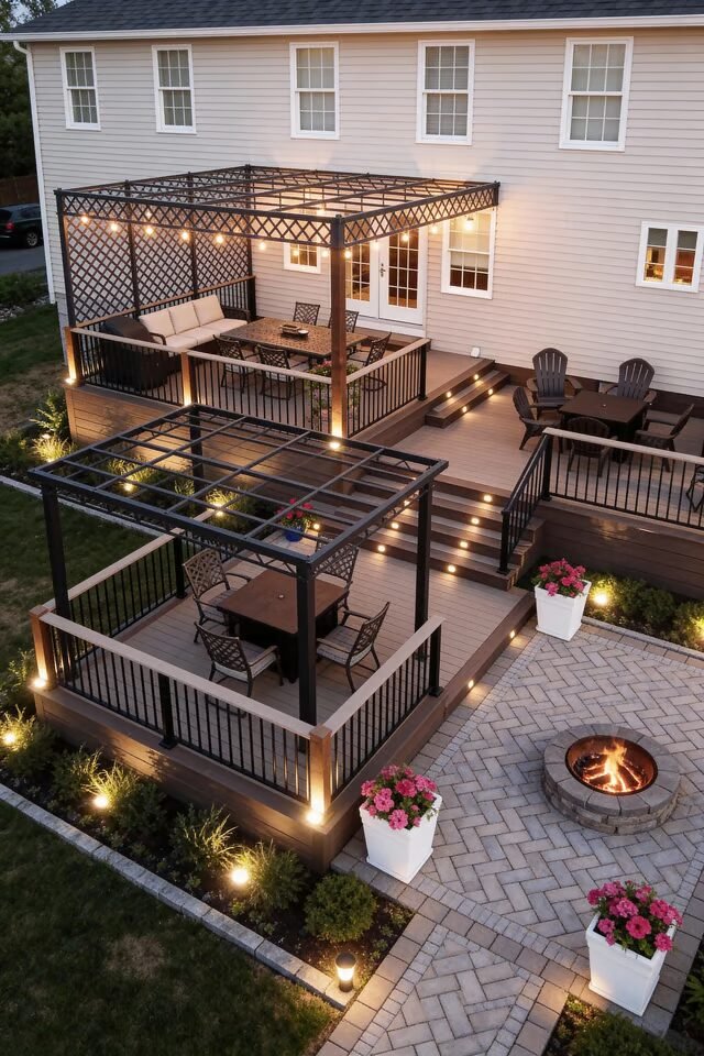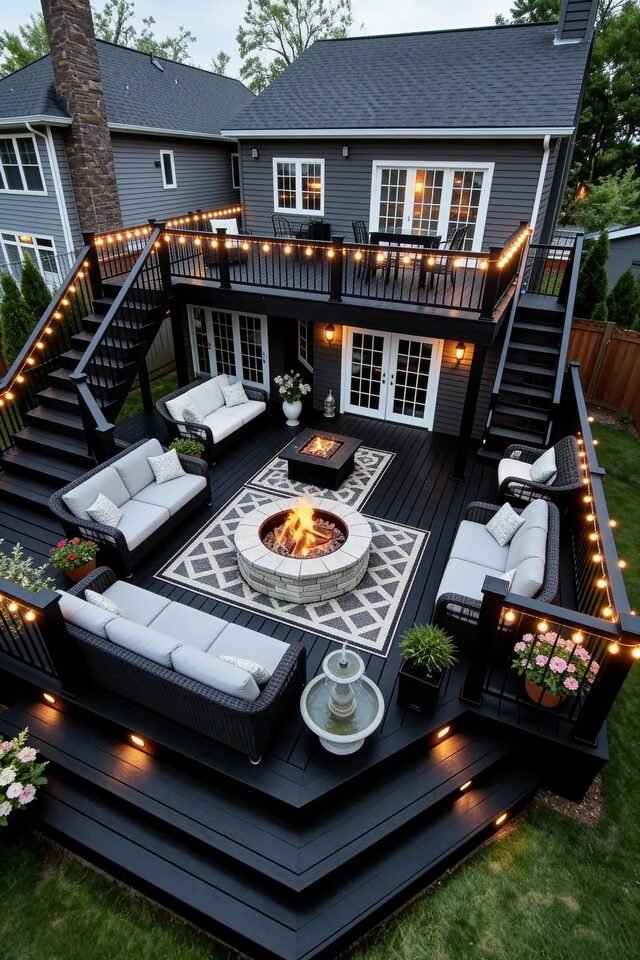 This deck proves that dark colors aren’t scary when used correctly. The black decking creates a bold base that instantly makes furniture and lighting pop. High contrast equals high impact, and this deck fully commits. Multiple levels help break up the dark surface, preventing it from feeling flat or heavy.