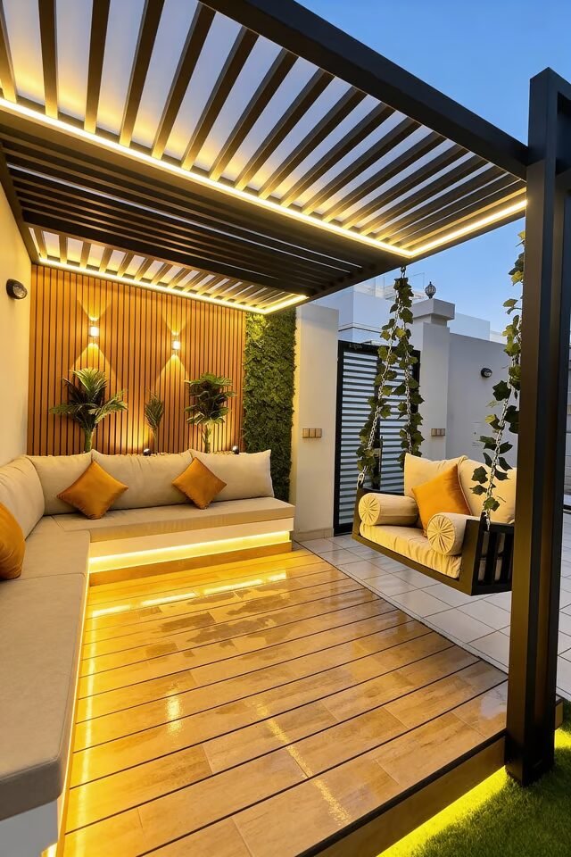 Warm light underneath benches creates a floating effect that visually lifts the furniture off the floor. That’s how small decks feel bigger without changing dimensions. If you’re recreating this, keep your color palette tight. Neutrals plus one warm accent color is enough.