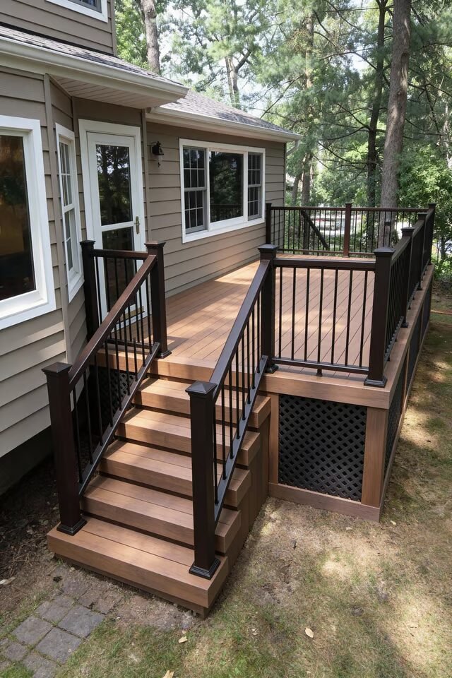 Notice how two wood tones are used on the steps. Contrast helps define edges and improves depth perception, which is both beautiful and practical. The covered roof structure anchors the deck to the house, making it feel like a true extension rather than an add-on. When recreating this, keep railing details slightly decorative but not dominant, so they frame the space without stealing attention.