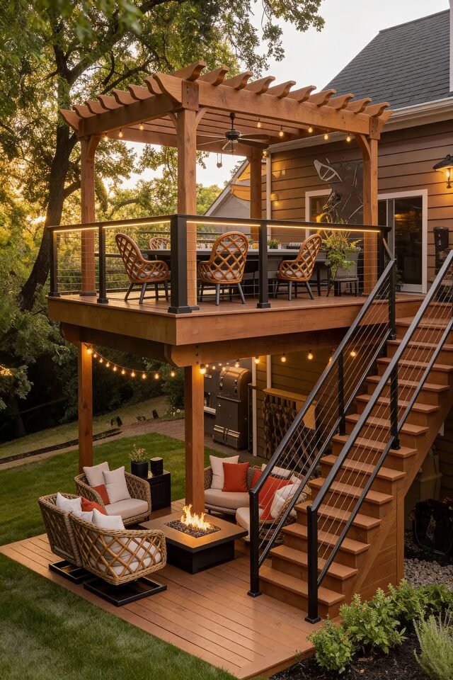 This deck is basically outdoor architecture done right. The two-story layout uses vertical space to separate activities without losing connection. Vertical zoning is a cheat code for small yards. The upper deck works as dining and viewing, while the lower level becomes a cozy lounge anchored by a fire feature.