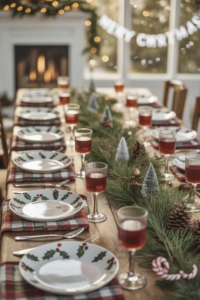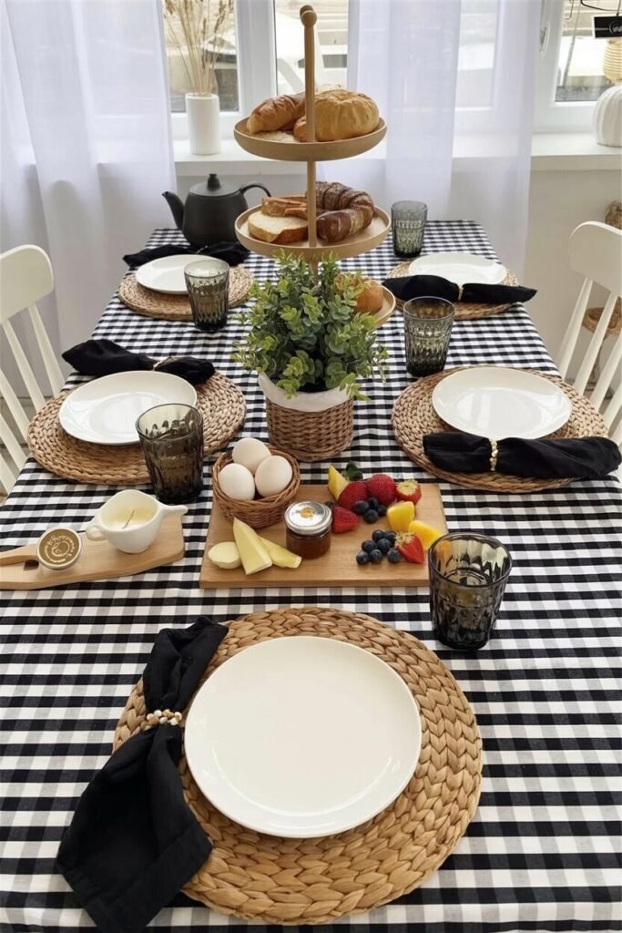 Balance is key here: the busy check pattern gets grounded by neutral textures like woven placemats and black napkins. Those small touches of greenery? Total game-changer for adding life. The pearls on the napkin rings subtly introduce a glam note without breaking the “casual chic” vibe.