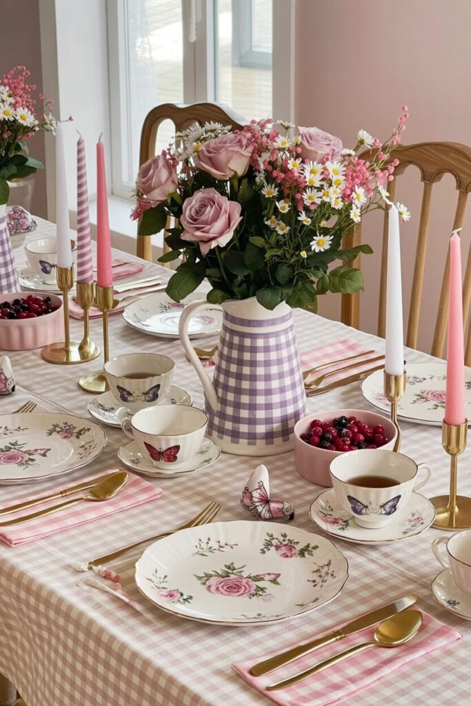 The secret here is color coordination — everything feels cohesive because it follows a palette: lilac, blush, ivory, and gold. When mixing patterns (like florals and gingham), balance them with solid elements such as plain napkins or simple gold flatware. Texture also matters — pairing ceramic, fabric, and brass keeps the scene dynamic.