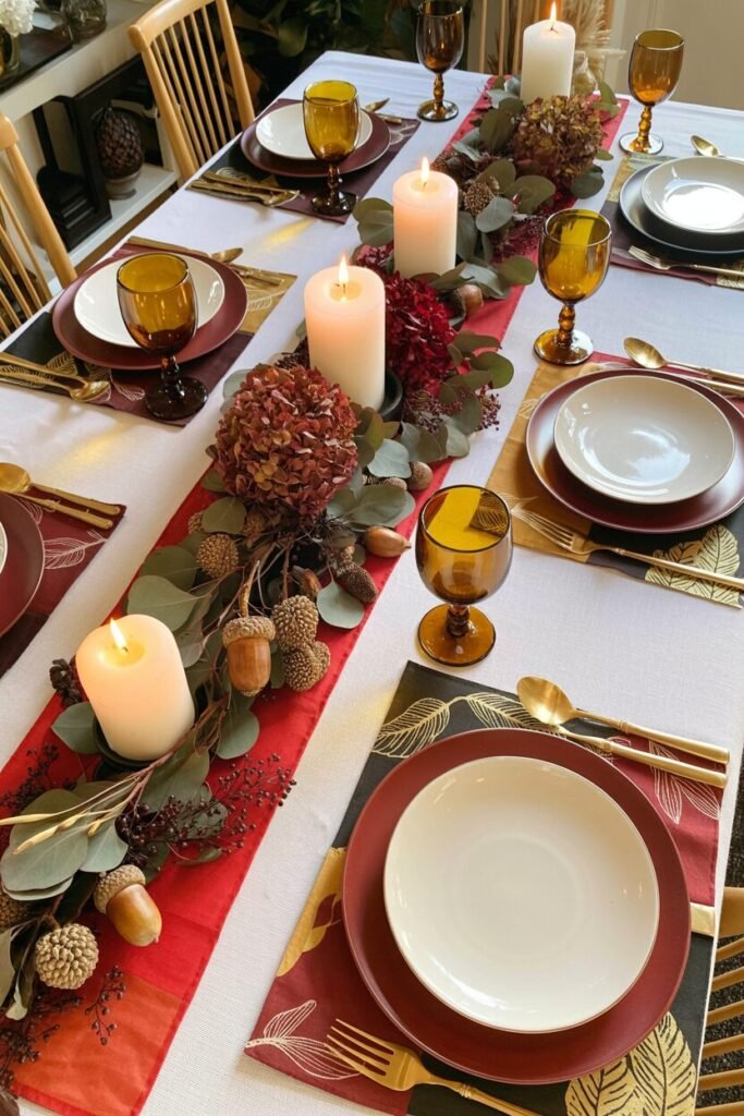 And yes, candles are basically free mood lighting. Opt for varied heights to guide the eye down the table. If we want to recreate this, we can forage some dried leaves or eucalyptus, throw in faux acorns or nuts, and boom — autumn glam achieved. Remember, it’s not about perfection; it’s about creating a table that feels like a warm hug (and smells like cinnamon tea).