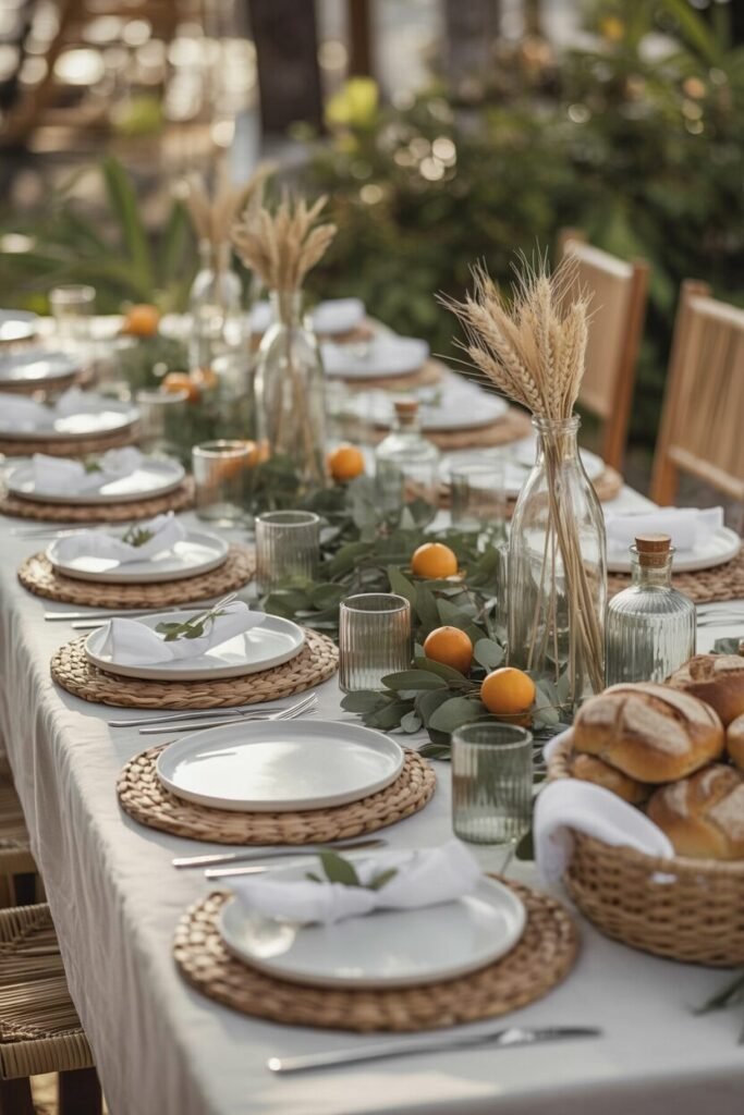 This table is what happens when Tuscan charm meets minimalist balance. The mix of woven chargers, green foliage, and fresh oranges creates the kind of effortless natural look that feels both inviting and elevated.