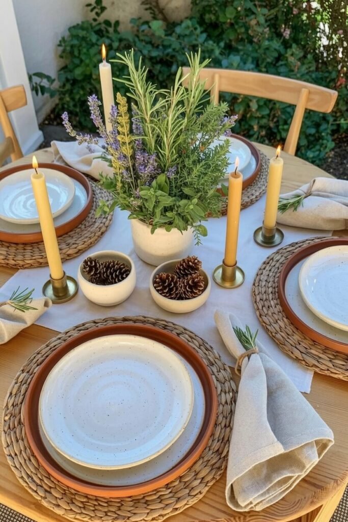 It’s casual but still cohesive, and it tells a story. Add some warm string lights or candles to make the pinecones glow at night. It’s giving cozy forest dinner party — the kind where everyone feels at home, and you secretly feel like a DIY genius.