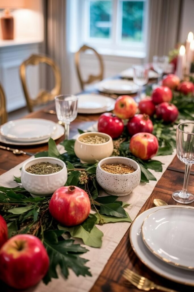 Okay, can we talk about how fresh and abundant this one looks? Bright red apples, lush greenery, and little ceramic bowls of spices — it’s the perfect balance of color and organic texture.