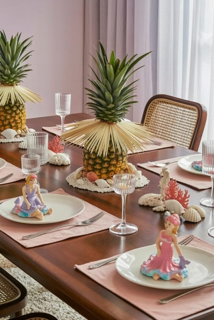 Notice the soft pink linens and simple white plates? They let the tropical elements — pineapples, shells, coral — take center stage. Pro tip: always anchor wild decor with neutral tableware. It creates visual calm so your theme doesn’t overwhelm the scene. We love how the textures here — rough pineapple skin, smooth glassware, natural coral — create a tactile story.