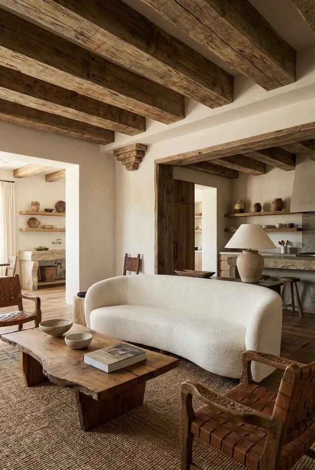 The curved neutral sofa contrasts against the rigid beams, creating tension in the best way. That’s a classic design move: pair structured elements with something soft. The low wood coffee table keeps sightlines open, which is essential in beam-heavy spaces. When ceilings are bold, keep furniture visually lighter.