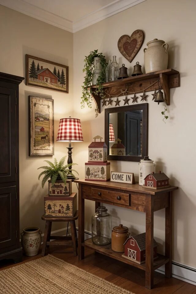 Okay but can we talk about how cute and functional this little corner is? Primitive style loves practical furniture, and a wooden console table with open shelving is both decorative and useful. Function first, beauty second, but we still make it pretty. That’s the mindset.