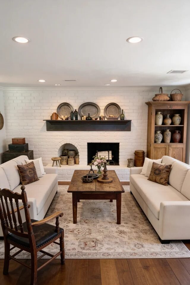 This setup proves primitive doesn’t have to mean dark and heavy. The white brick fireplace acts as a visual reset, letting wood tones and antique pottery shine. Contrast is the secret weapon here. We’re pairing creamy sofas with a rustic coffee table to balance softness and rugged texture. That’s how we keep the space from feeling overly farmhouse or overly formal.