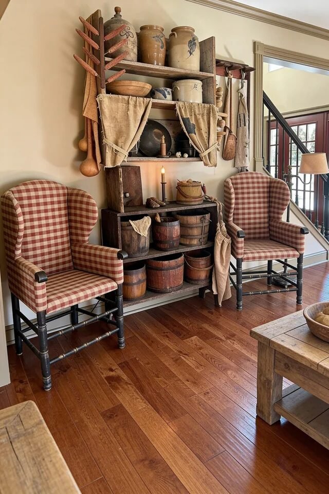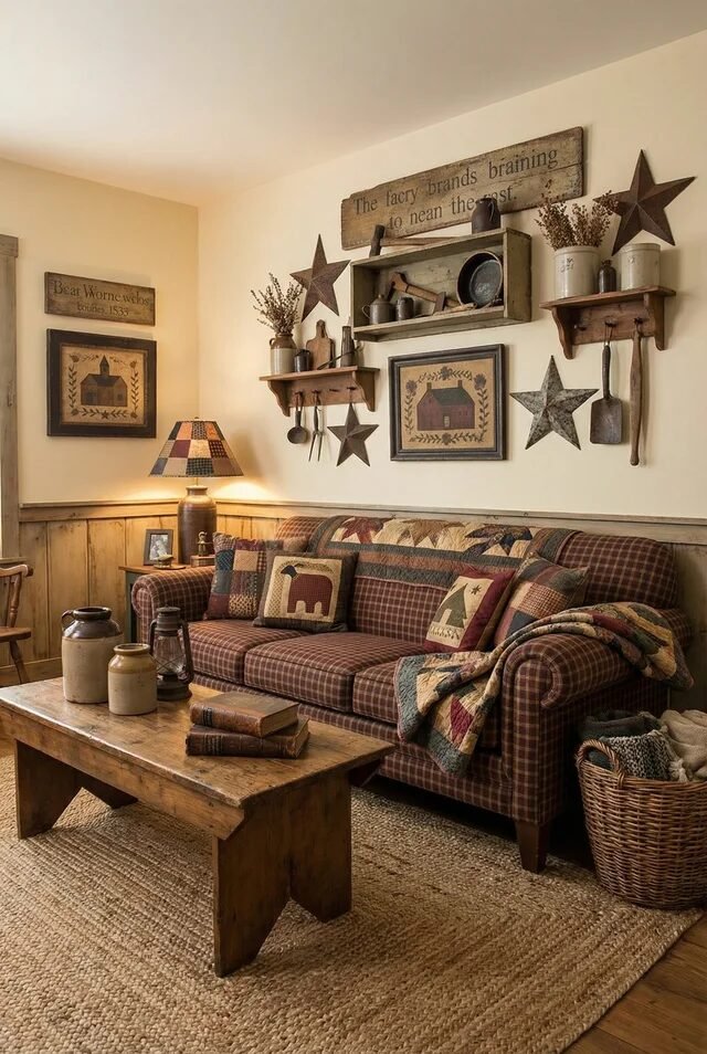 When styling shelves, mix pottery, baskets, and framed art in odd groupings. Primitive design works best when layered slowly over time, not styled all at once.