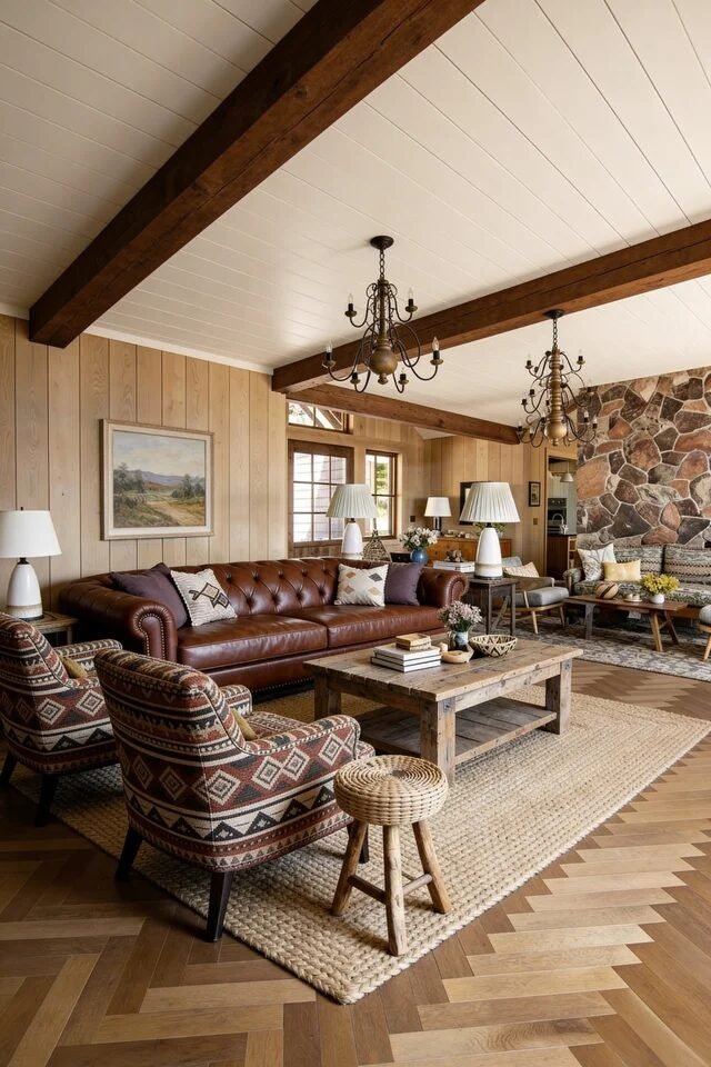 When recreating this look, focus on strong focal points like fireplaces, hutches, or architectural beams. Arrange seating to encourage conversation, and always anchor layouts with properly sized rugs. Lighting should stay warm and soft because harsh brightness instantly breaks the mood. Ambient glow is essential for that signature primitive coziness.