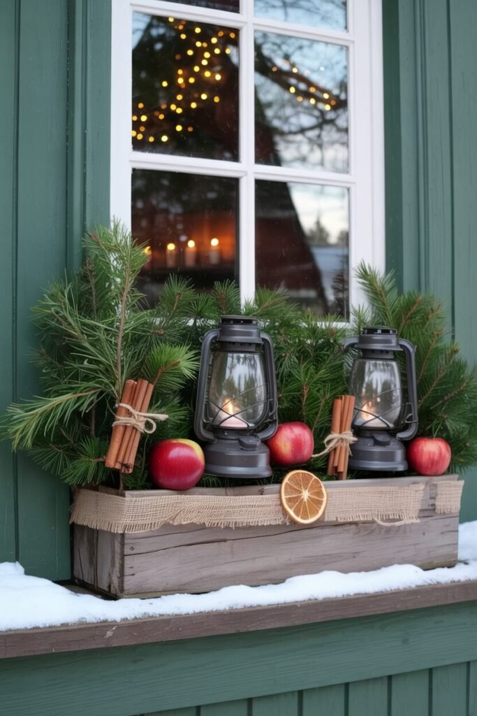 The vintage lanterns act as anchors that balance all the natural chaos, so make sure to place them evenly and light them with LED candles for safe, flickering glow. Style tip: Use varying heights of greenery around the lanterns to create a soft, rolling shape — it adds movement and prevents your box from feeling stiff. This idea works beautifully for both outdoor windows and entryway tables.