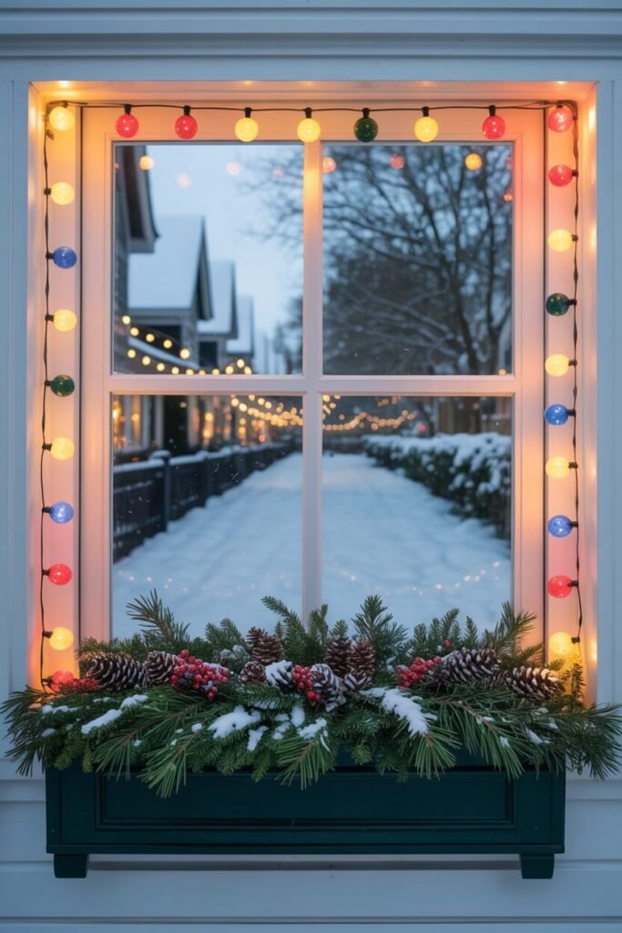 This one’s pure nostalgia — colorful bulbs framing the window, pine garland dusted with snow, and pinecones nestled like tiny treasures. It’s a retro revival done right, proving that bright colors can still feel chic when balanced with natural greens.