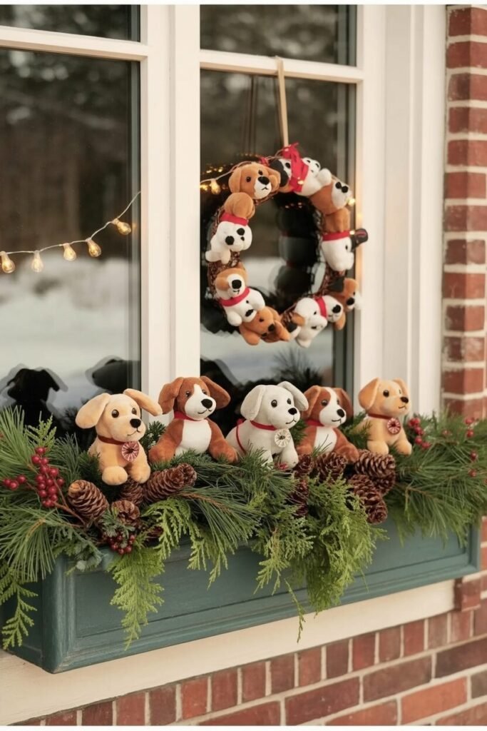 If your love language is cuteness, this one’s for you. Plush puppies lined up across a cedar and pine window box? That’s a serotonin boost waiting to happen. The key to this cheerful setup is repetition with personality — each puppy toy feels unique, yet collectively they tell a cohesive story of holiday joy.