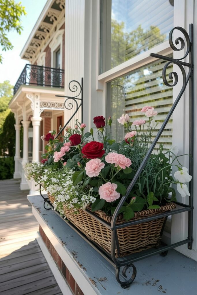 Using a wicker basket planter softens the overall look, while a black wrought-iron frame adds that elegant contrast designers love. To recreate this at home, position taller blooms like roses toward the back, medium ones like carnations in the middle, and let smaller white flowers spill slightly over the edge for a relaxed, lived-in vibe.