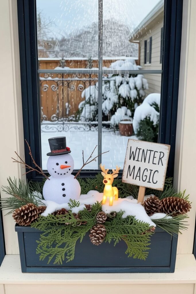 Nothing says winter cheer quite like a tiny snowman greeting guests from your window. The playful “Winter Magic” sign adds instant charm, while the glowing reindeer figure introduces warmth to contrast the icy whites. What makes this setup shine is the balance between whimsy and simplicity — the greenery base of pine and cedar acts as a calm foundation, letting the cute figures steal the spotlight.