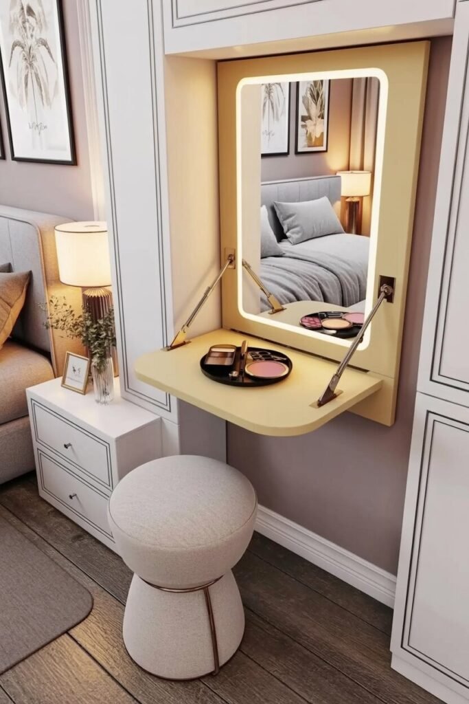 No one will ever know you have a full makeup station hidden in your room with this genius setup. A fold-away vanity is the ultimate secret weapon for anyone with minimal space. This design is built right into the wall, with a tabletop that folds up and a mirror that tucks away, which is a major win for keeping your room looking tidy and clutter-free.