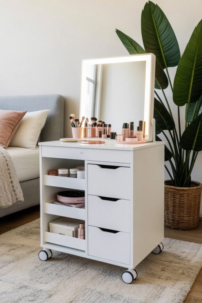 Add a large, lighted mirror on top and use acrylic organizers inside the drawers to keep everything neat and visible. This is perfect for anyone who likes to change up their routine or simply wants the freedom to glam wherever they please!