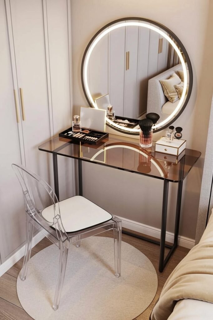 The secret to making a small room feel bigger? Furniture that disappears! A transparent vanity is the ultimate optical illusion for small bedrooms. The clear glass top and see-through chair create an open, airy feel, making the entire space look less cluttered and more spacious.