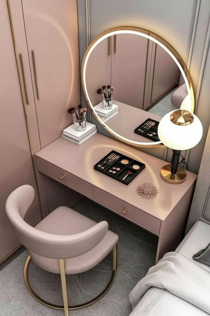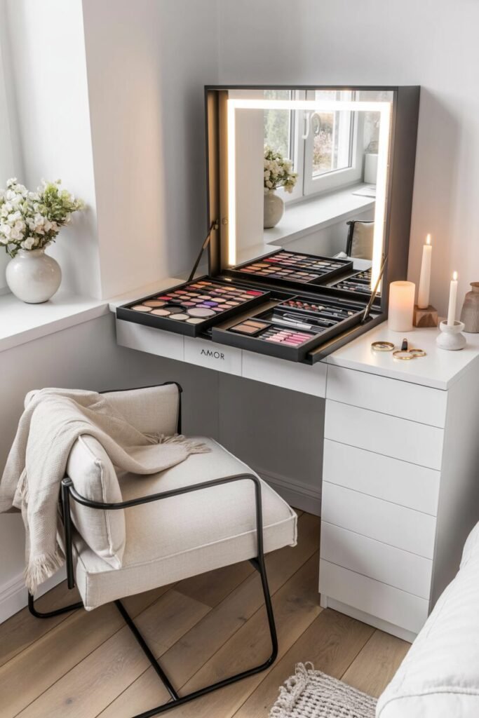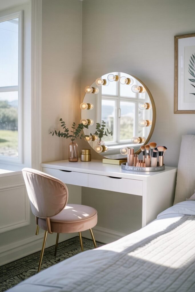 We also suggest adding some soft, warm lighting and a plush, comfortable chair to make your makeup routine feel luxurious and inviting.