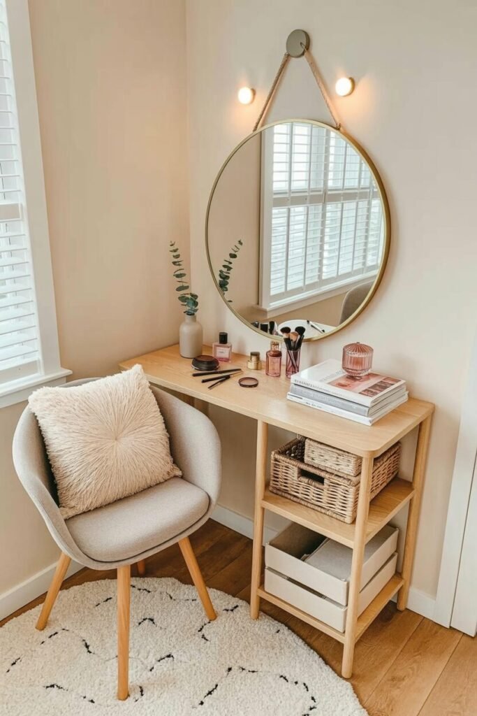 Pair it with a statement mirror—like this large round one—to add a touch of style. We also recommend adding some soft textures, like a fluffy rug and a comfortable chair, to make the space feel cozy and inviting. It’s a simple and effective way to create a stylish, functional vanity that’s perfect for any small room.