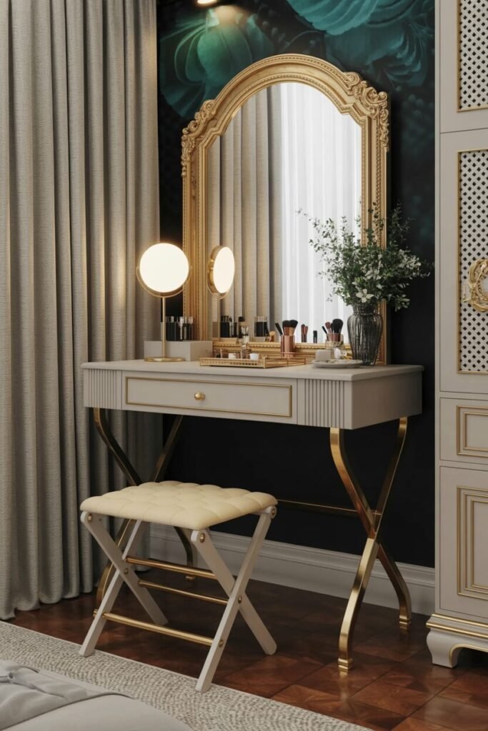 It’s a stylish and incredibly clever way to have a dedicated beauty area without it dominating the room. To recreate this look, choose a vanity with a simple metal frame and a glass or acrylic top. The key is to keep the surface clear and organized, with a few carefully selected products on display.