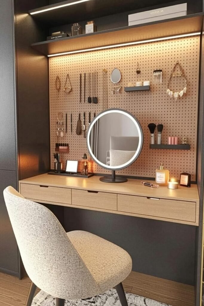 If you’re a fan of having everything within reach and on display, this one’s for you. A pegboard vanity is not only incredibly practical but also a super fun way to show off your favorite accessories and makeup.