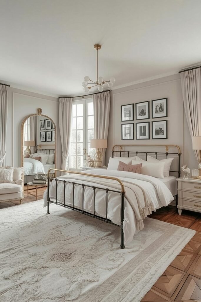 This look doesn’t scream luxury—it sips espresso with perfect posture and knows things. Start with bedding so crisp it practically crackles, add a wrought-iron detail (like a headboard or a light fixture that’s just so), and finish with one ridiculously dramatic, oversized floral arrangement.