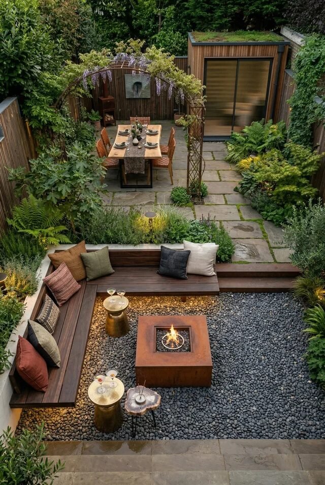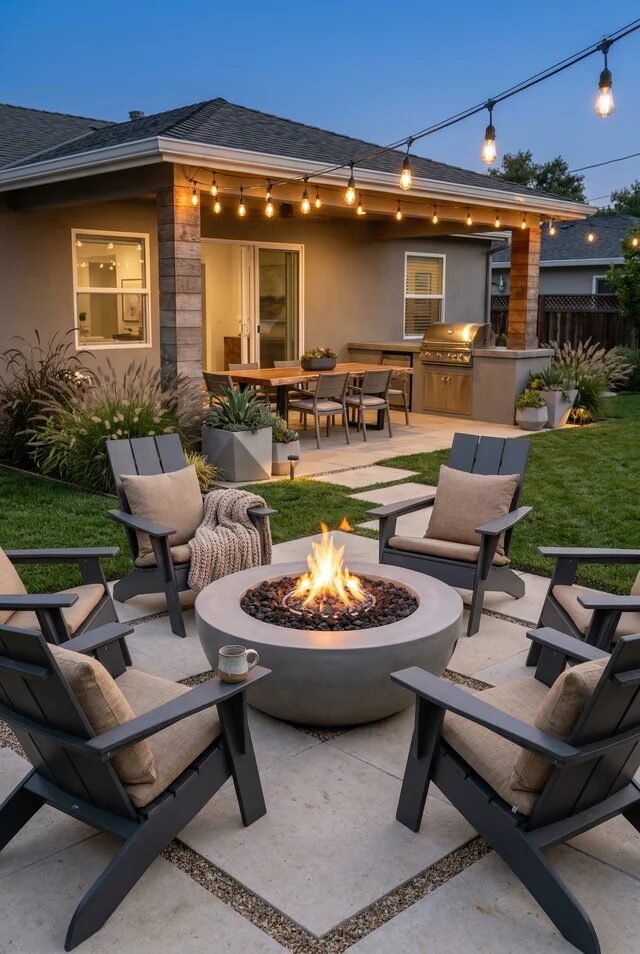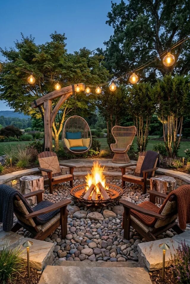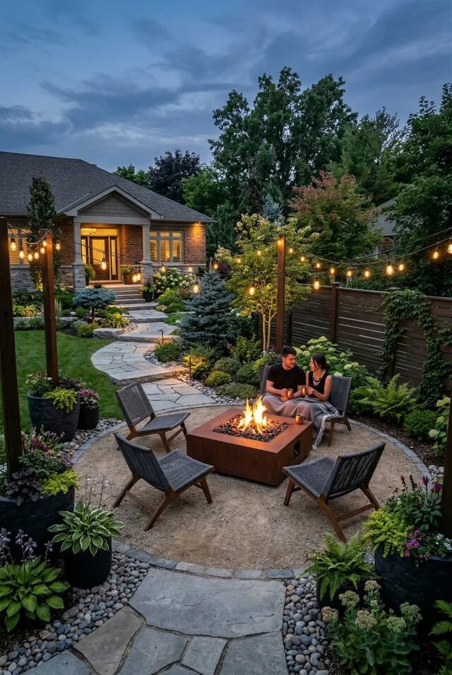 This one is giving “we planned this… but also it just magically works.” The circular gravel zone instantly defines the fire pit area without needing heavy hardscaping. Using material contrast (gravel vs. stone path) is a subtle zoning trick that makes spaces feel intentional without walls. Add string lights overhead and suddenly the whole setup feels like an outdoor café moment.