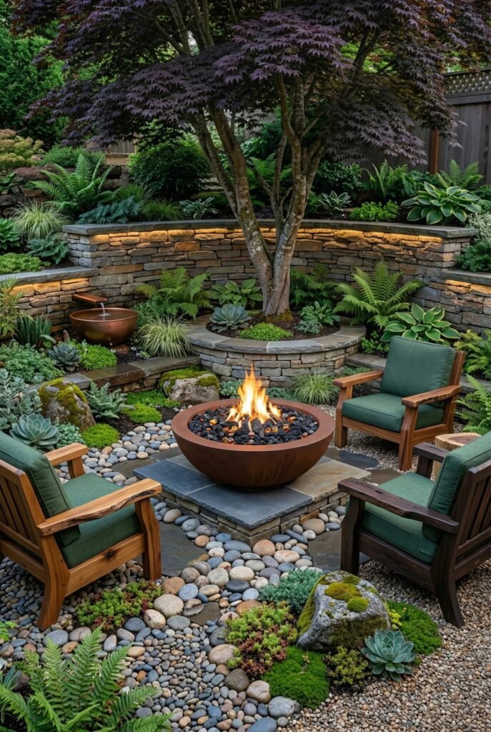 Notice how the circular layout keeps everything cohesive. Circles are your best friend with fire pits because they naturally encourage conversation and visual flow. The mix of textures—smooth river rocks, rough stone, and lush greenery—keeps the space from feeling flat. We’re balancing hard and soft elements so nothing visually overwhelms the other.