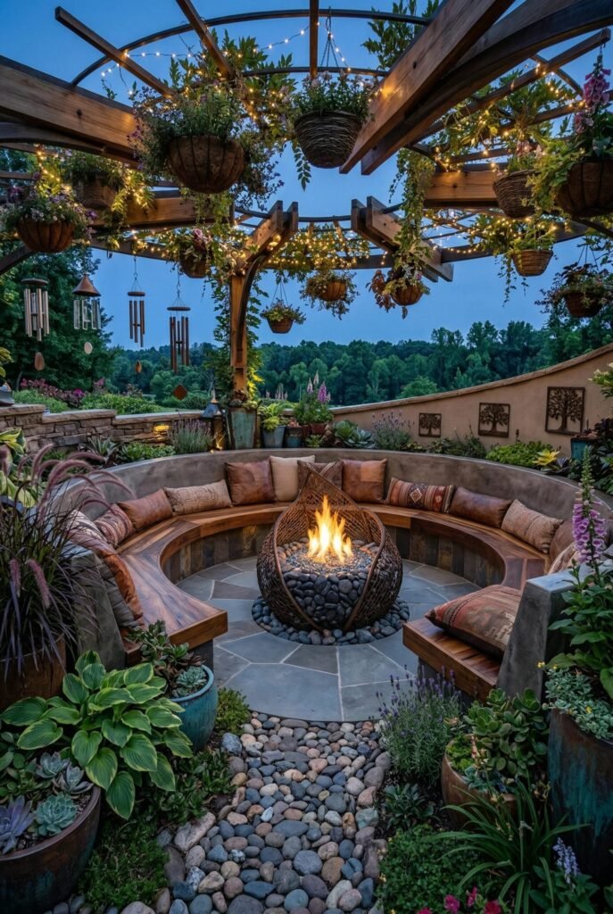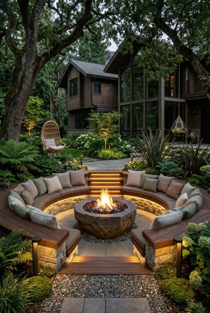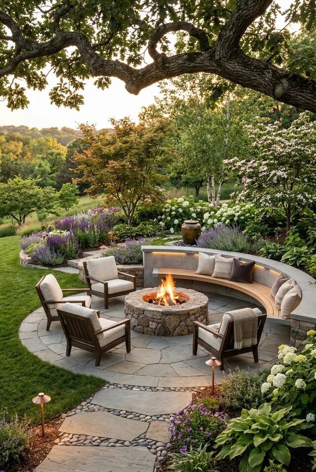 This one feels like a Pinterest board came to life, but with actual design logic behind it. The curved bench isn’t just pretty—it anchors the space and frames the fire pit perfectly. Curved seating creates a natural gathering zone without needing excess furniture clutter. Plus, it subtly directs your eye outward toward the landscape, which is doing a lot of the visual work here.