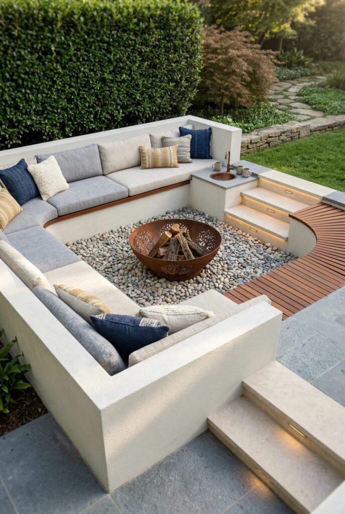 This is minimalism, but make it cozy. The sunken seating instantly creates a defined zone, while the gravel base adds texture without visual clutter. Using gravel instead of grass or pavers keeps the look clean while still feeling organic. It’s low-maintenance, budget-friendly, and surprisingly chic when done right.