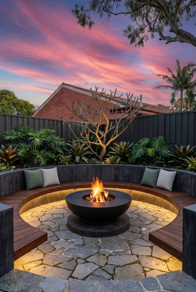 This one is low-key dramatic in the best way. The central fire pit is strong, but that sculptural tree behind it? That’s the plot twist. Adding a vertical focal point behind your fire pit creates depth and makes the whole space feel layered, not flat. It’s like giving your backyard a backdrop.