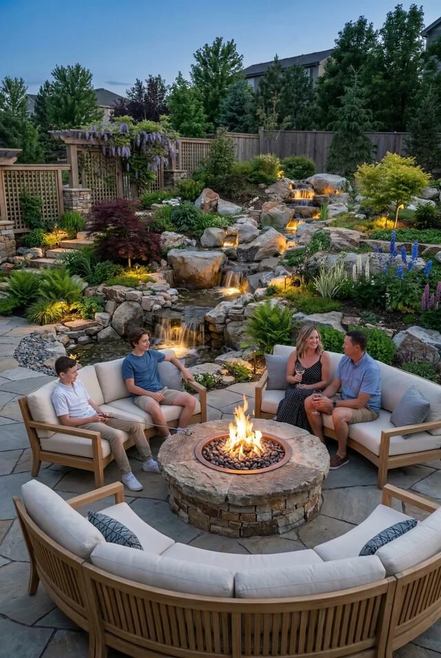 If you want this look, start with your sightline. Position your fire pit where the view is best, then build seating around it. Use neutral cushions so the landscape remains the star. And don’t skip path lighting—it quietly guides movement while making everything look 10x more intentional.