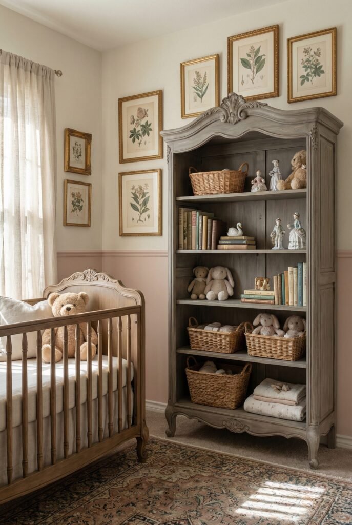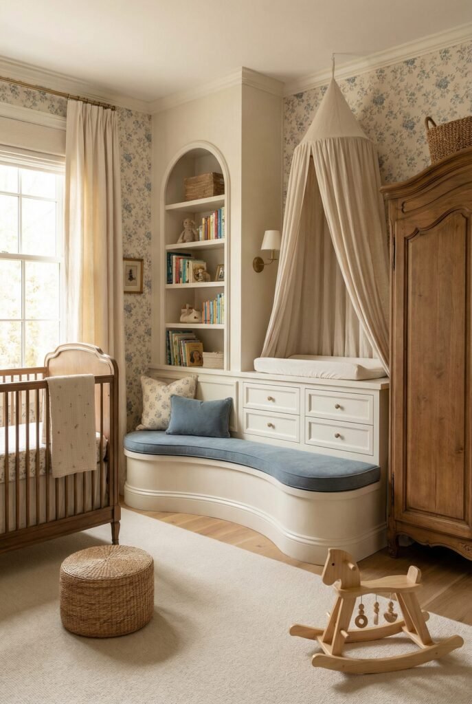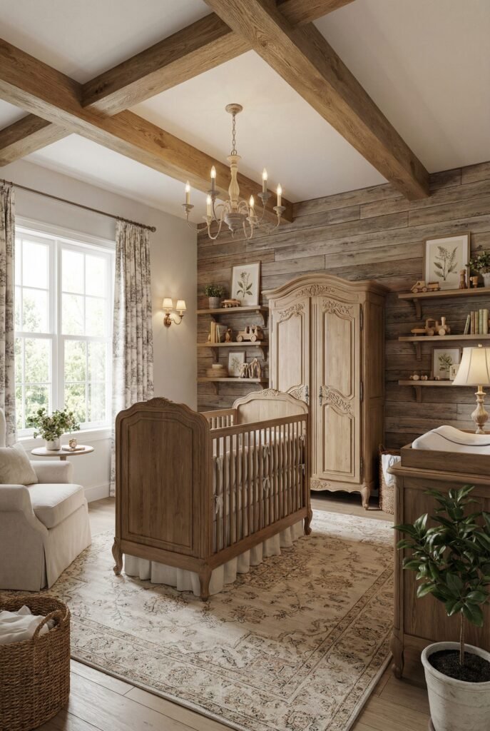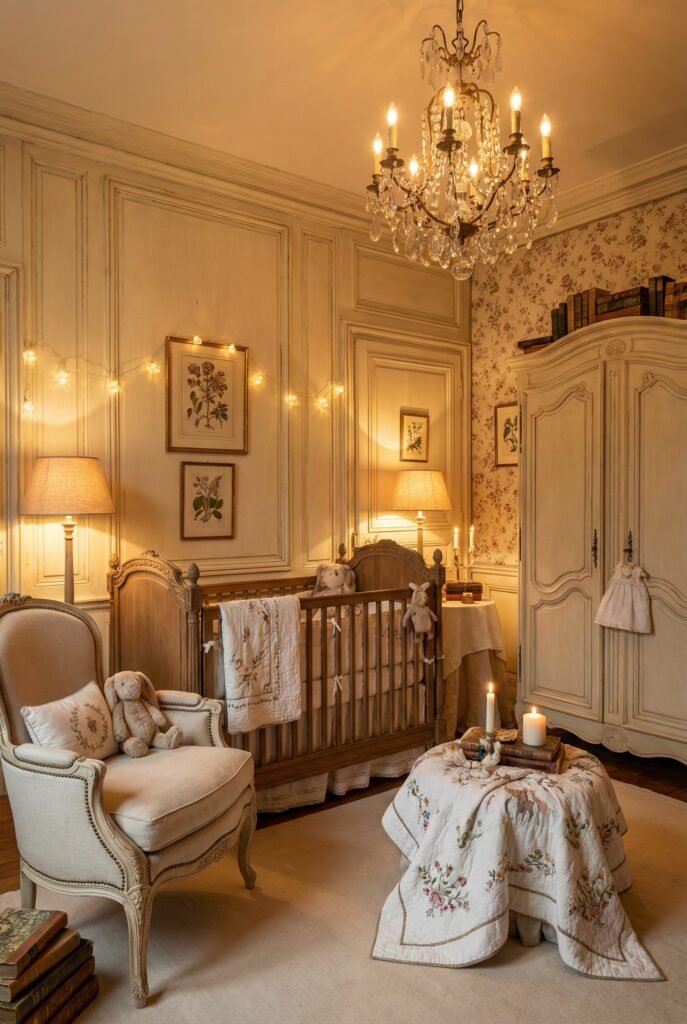 If you want to recreate this, focus on traditional silhouettes first, then soften them with textiles like embroidered throws or linen bedding. We also love the subtle wall paneling because it adds architectural depth without using bold color. Pro tip from us: mix one “heirloom-looking” piece with modern safety standards so the room feels storied, not dated. Yes, French vibes, but make it baby-proof.