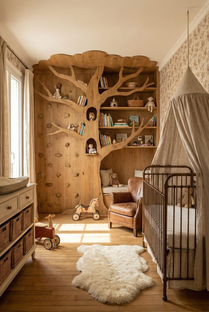 This idea is playful but still very controlled, which is exactly what good design should do. The tree-shaped bookshelf is the hero, but the rest of the room stays neutral so it doesn’t feel overwhelming. Statement pieces need quiet surroundings, and this nursery nails that balance.