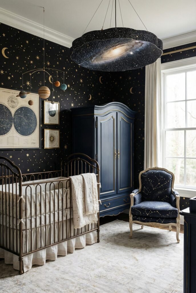 The galaxy ceiling fixture becomes a focal point, drawing the eye upward and making the space feel taller and more immersive. We also love how traditional French furniture silhouettes keep the room elegant, preventing the space theme from tipping into “theme park.” If you want to recreate this, keep your large furniture pieces neutral or classic, then let the walls tell the story.