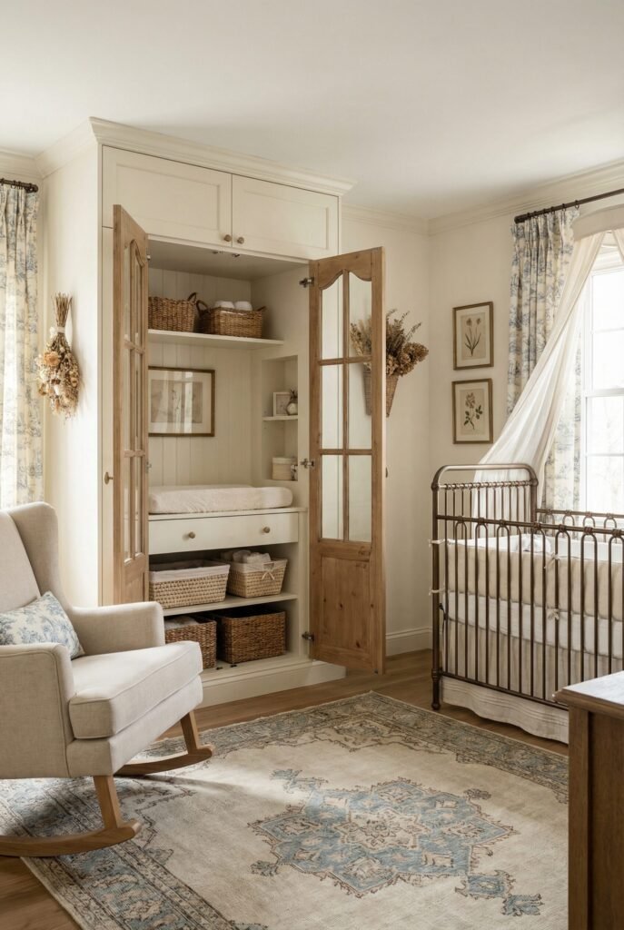 That’s a huge win for smaller nurseries. Earthy woods, iron crib details, and terracotta floors ground the space so it doesn’t feel overly precious. French-inspired doesn’t mean fragile, and this room proves it. If you want to recreate this look, anchor the room with natural materials first, then layer soft textiles so it stays baby-friendly.