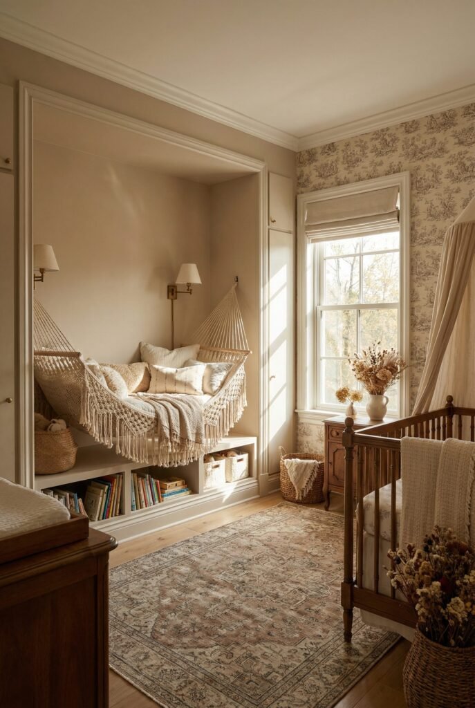 We also recommend mixing woven elements with structured furniture to balance softness and stability. The hammock works because it’s visually light and framed by built-ins, not floating randomly. Our bonus tip: boho nurseries feel best when the color palette stays narrow. Let materials, not colors, do the talking.
