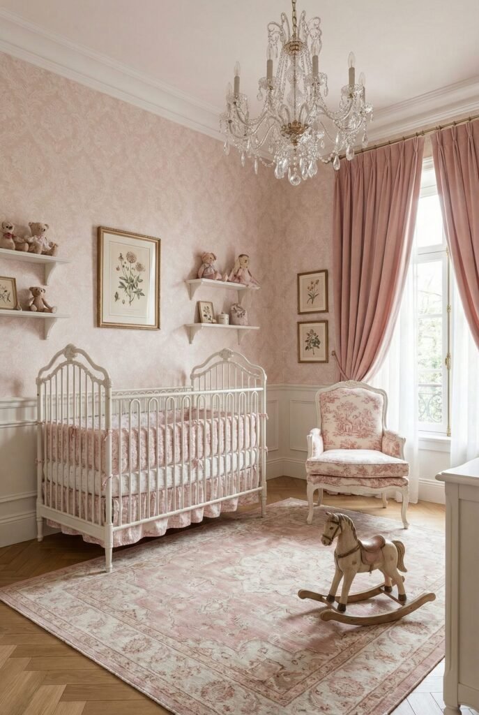 The chandelier adds sparkle, while the vintage-style crib anchors the space with structure. From a decor principle perspective, repetition is key here: similar tones appear across walls, textiles, and furniture, creating cohesion. If you want to recreate this look, avoid high-saturation pinks and stick to dusty, muted shades.