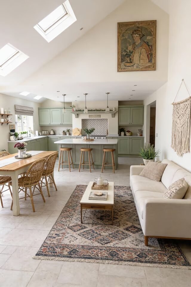 This open plan works because it nails visual continuity without visual boredom. The soft green cabinetry flows into the dining and living zones, so the space feels connected instead of chopped up. That’s a core open-plan rule: repeat one dominant color across zones to keep the eye moving smoothly. The island acts as a social bridge, not just a prep station.