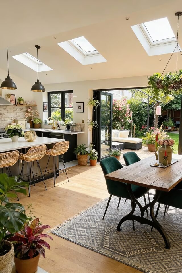 Indoor-outdoor flow isn’t just about big doors—it’s about alignment. This open plan nails it by lining up the dining table directly with the garden view. Your eye moves straight through the space, which makes everything feel larger and lighter. The dining area uses darker chairs to visually anchor the table, so it doesn’t float awkwardly in the room.