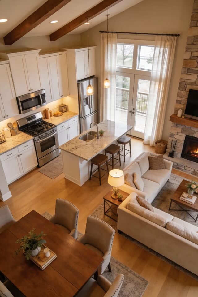 This idea proves open plan doesn’t need bold colors to feel rich. It relies on layered neutrals with varied textures, which is way harder than it looks. White cabinetry, light wood floors, soft beige seating—sounds boring, but texture saves the day. Stone, wood grain, fabric, and subtle pattern all work together to create depth without visual noise.