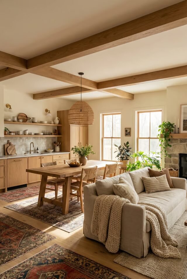 Rustic elements can overwhelm an open plan fast, but this space keeps them on a tight leash. The exposed beams add character without stealing attention because everything else stays visually calm. That’s the balance: one statement feature, many supporting neutrals.