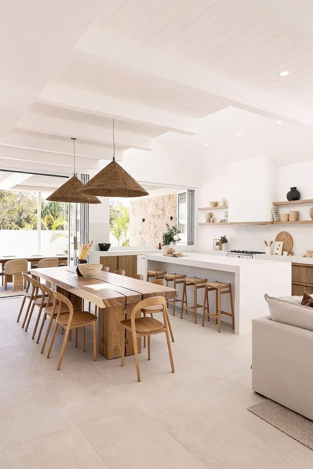 This open plan leans into Mediterranean simplicity with social-first logic. The long dining table isn’t just furniture—it’s the anchor. In open layouts, anchoring with one oversized element keeps the space from feeling floaty. Here, the table visually balances the long kitchen run and wide negative space around it.
