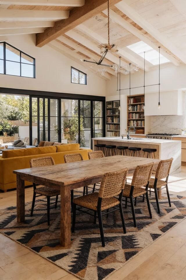 This open plan nails contrast without chaos. The rough, oversized dining table grounds the space, while the clean kitchen island keeps things visually sharp. That push-and-pull is intentional. Open plans need contrast to avoid looking flat, but it has to be controlled. The table sits on a bold patterned rug, clearly defining the dining zone without blocking flow.