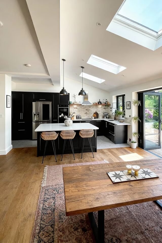Notice how the stools face outward—that’s intentional. It invites conversation while cooking, which is peak open-plan behavior. We also love how lighting is layered: skylights for daylight, pendants for task, recessed lights for ambient glow. That combo prevents the space from feeling flat at night. The dining table sits close but not cramped because circulation paths are respected.