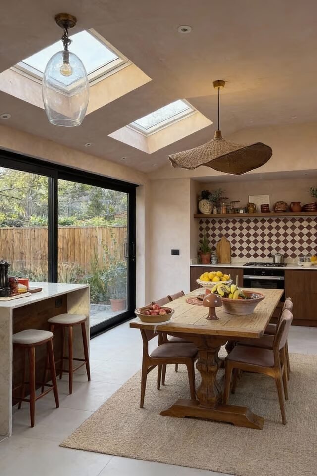 This open plan leans cozy, not cavernous—and that’s the win. The dining table sits under skylights, which naturally spotlights the area without extra visual noise. Natural light is the best zoning tool you already own. Warm wood tones repeat across table, cabinetry, and stools, creating a loop that visually connects zones.